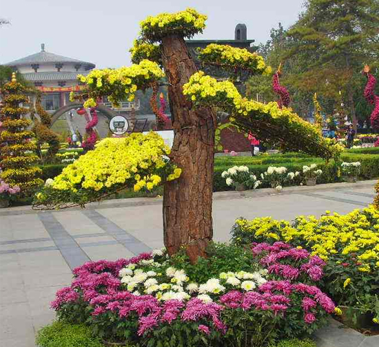 后,菊花造型应与背景自然协调,相映成趣,这样才能提高园林的美观,带来美的体验。
