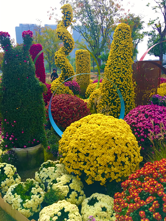 后,菊花造型应与背景自然协调,相映成趣,这样才能提高园林的美观,带来美的体验。