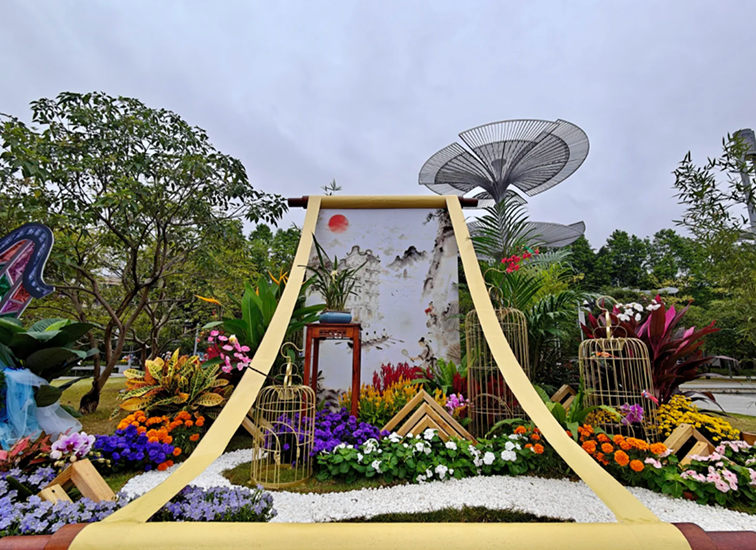 后,菊花造型应与背景自然协调,相映成趣,这样才能提高园林的美观,带来美的体验。